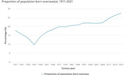 • According to the Australian Bureau of Statistics, Australia is in 2021 27.6% of the Australian population were born overseas. Please refer to the graph below to review the growth in the proportion of people who were born overseas since 2006.